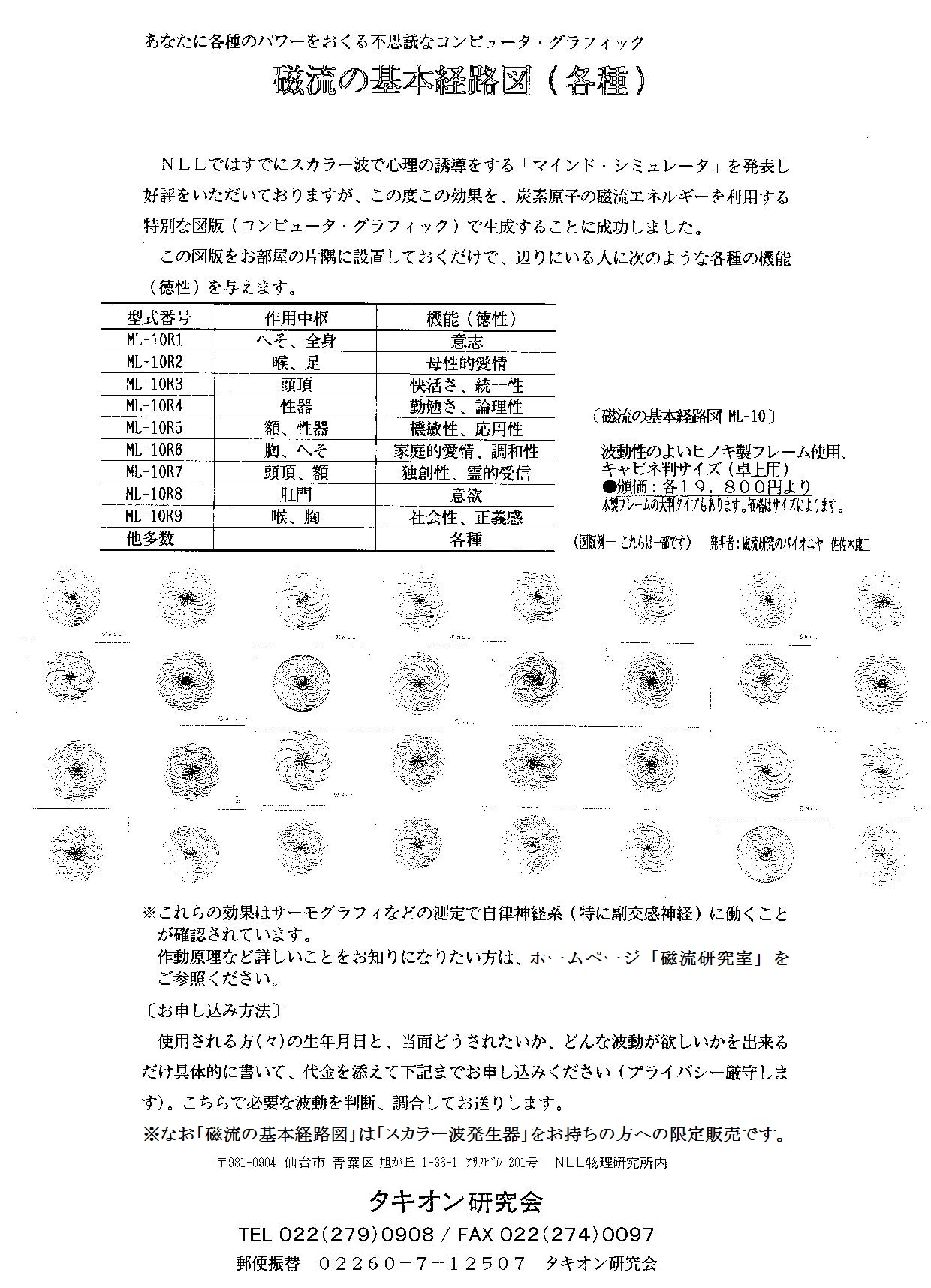 このコーナーはNLL物理研究所が「磁流理論」 の応用として開発した製品のうち「磁流の基本経路図」M L-10Rシリーズについてのご案内です。「磁流の基本経 路図」はスカラー波発生器SC−100Jなどの装置にセット されることでス カラー波波源 として働きま す。「磁流の基本経路図」とはエネルギー流の宇宙共通の構 造単位である「磁流の基本経路」というものを描いたコンピュータ・ グラフィックですが、ただのコンピュータ・グラフィックではありません。